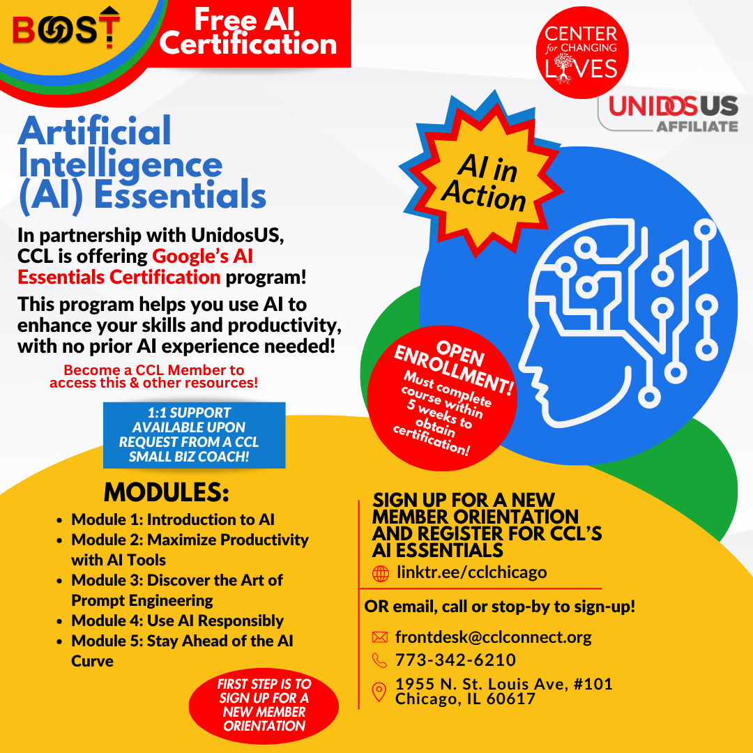 ¡En colaboración con UnidosUS, CCL ofrece el programa de Certificación Esenciales de IA de Google! Este programa te ayuda a usar la IA para mejorar tus habilidades y productividad, ¡sin necesidad de experiencia previa en IA!